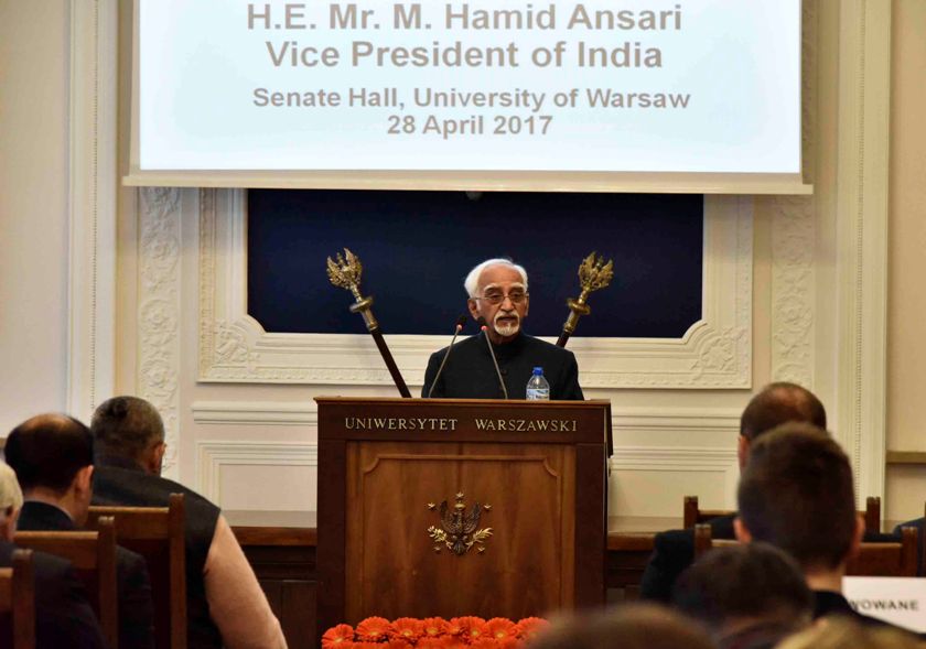 Shri M. Hamid Ansari, Hon’ble Vice President of India delivering the lecture at the University of Warsaw, in Warsaw, Poland on April 28, 2017. The Minister of State for Micro, Small & Medium Enterprises, Shri Giriraj Singh is also seen.