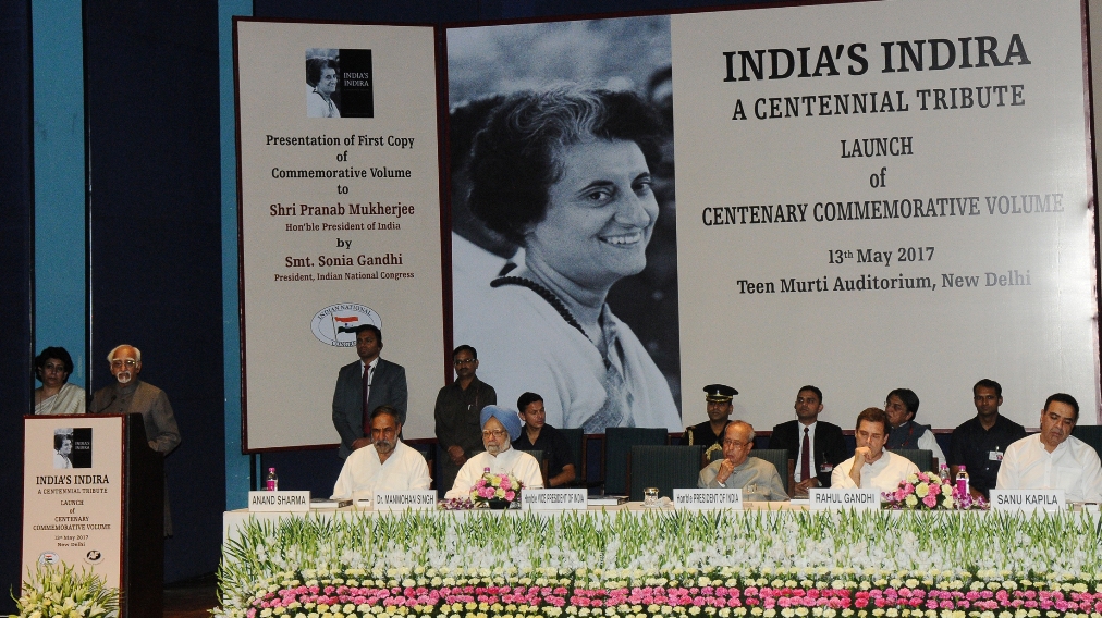 Shri M. Hamid Ansari, Hon’ble Vice President of India addressing the gathering after releasing the Commemorative Volume “India’s Indira-A Centennial Tribute” in New Delhi on May 13, 2017. The President of India, Shri Pranab Mukherjee and other dignitaries are also see.