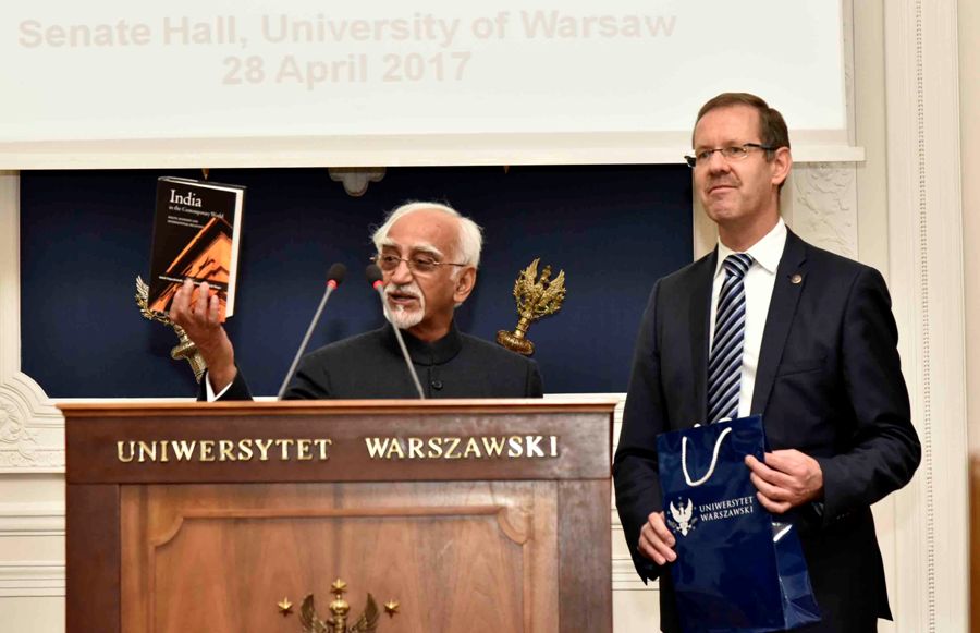 Shri M. Hamid Ansari, Hon’ble Vice President of India showing the book titled ‘India in the Contemporary Word’ presented by the Rector of the Warsaw University, Prof. Marcin Palsy, following his lecture at the University of Warsaw, in Warsaw, Poland on April 28, 2017.