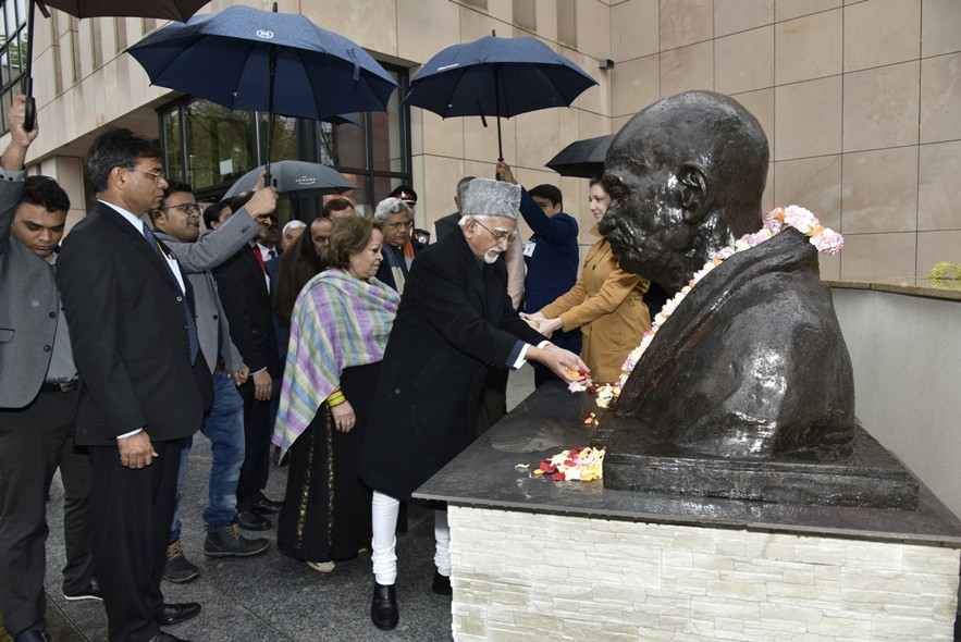 Shri M. Hamid Ansari, Hon’ble Vice President of India paying floral tributes at the bust of Mahatma Gandhi at the Embassy of India Complex, in Warsaw, Poland on April 28, 2017.