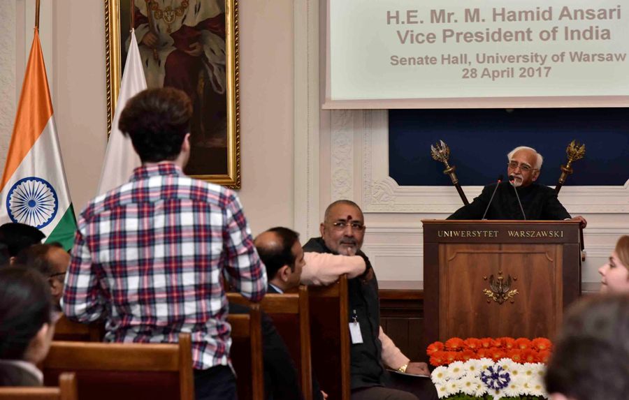 Shri M. Hamid Ansari, Hon’ble Vice President of India interacting with the students following his lecture at the University of Warsaw, in Warsaw, Poland on April 28, 2017. The Minister of State for Micro, Small & Medium Enterprises, Shri Giriraj Singh is also seen.
