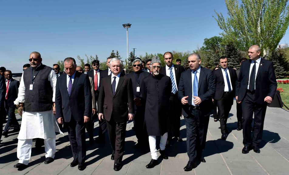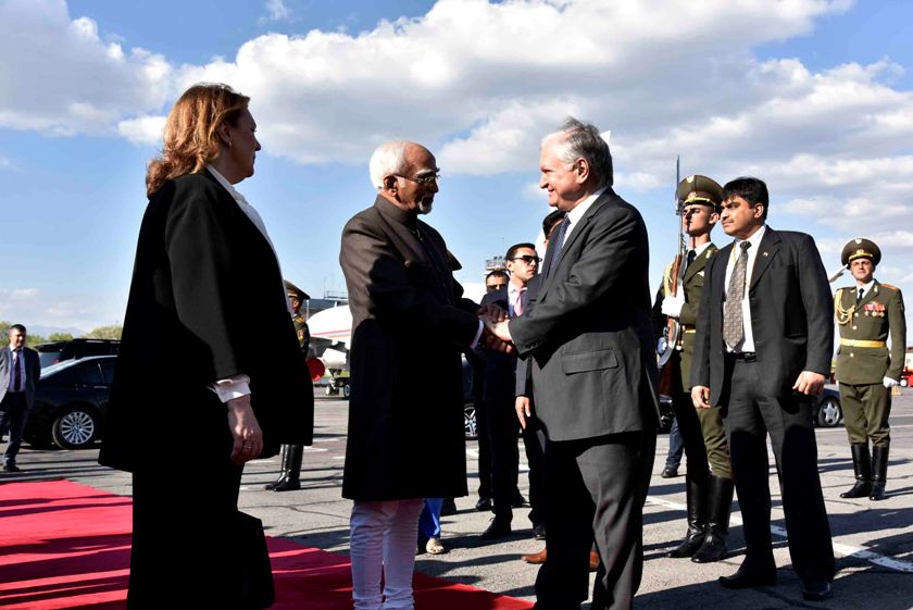 - Shri M. Hamid Ansari, Hon’ble Vice President of India being received by the Minister of Foreign Affairs, Armenia, Mr. Edward Nalbandian at the Memorial of the victims of Armenian Genocide, in Yerevan, Armenia on April 25, 2017. The Minister of State for Micro, Small & Medium Enterprises, Shri Giriraj Singh is also seen. April 25, 2017