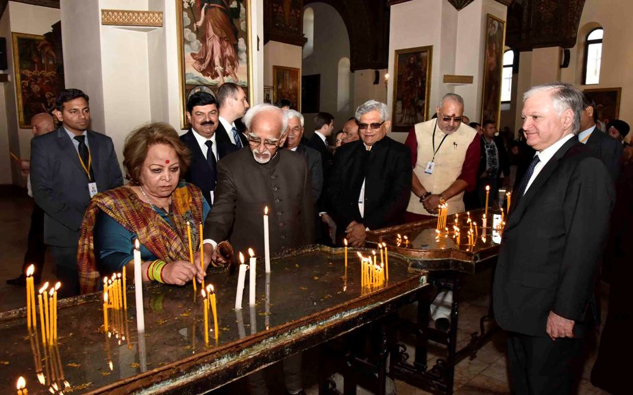 - Shri M. Hamid Ansari, Hon’ble Vice President of India and Smt. Salma Ansari lighting the candles at the Mother See of Holy Etchmiadzin, in Yerevan, Armenia on April 26, 2017. The Minister of Foreign Affairs, Armenia, Mr. Edward Nalbandian and the Minister of State for Micro, Small & Medium Enterprises, Shri Giriraj Singh are also seen. April 26, 2017
