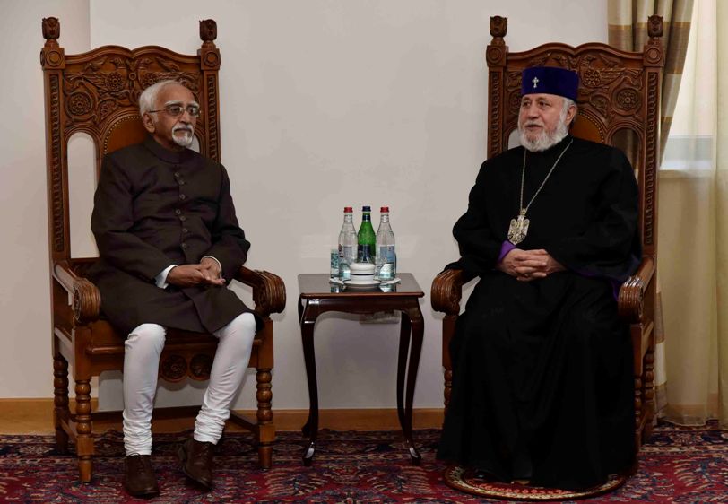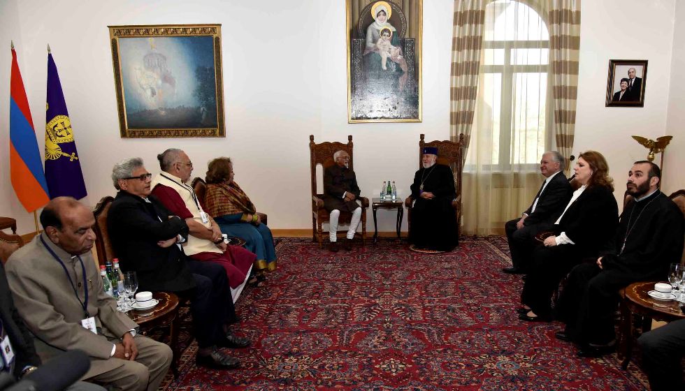 - Shri M. Hamid Ansari, Hon’ble Vice President of India with the Supreme Patriarch and Catholicos of all Armenians, His Holiness Karekin II, at the Mother See of Holy Etchmiadzin, in Yerevan, Armenia on April 26, 2017. The Minister of Foreign Affairs, Armenia, Mr. Edward Nalbandian and the Minister of State for Micro, Small & Medium Enterprises, Shri Giriraj Singh are also seen. April 26, 2017